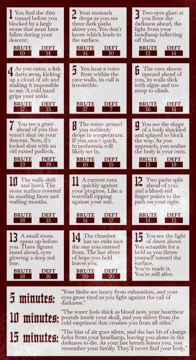You feel the crushing weight of the water around you as you slowly navigate through these underwater caves. Now, as your air supply runs low, the realization that you may not make it out alive weighs you down. You only have 15 minutes of air remaining.